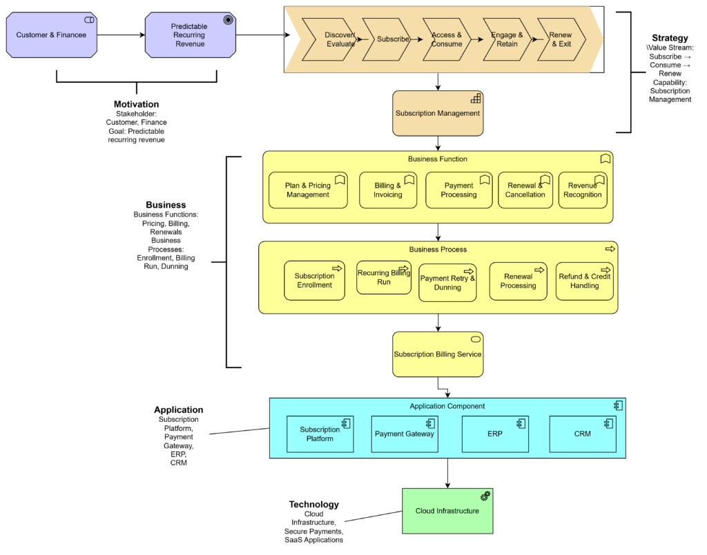 The Subscription (Recurring Billing) capability enables an organization to monetize products and services through recurring charges. It supports the end-to-end lifecycle of a subscription—from plan definition and customer enrollment to billing, renewal, modification, and termination—ensuring predictable revenue and scalable monetization. The key characteristics of a subscription management systems are