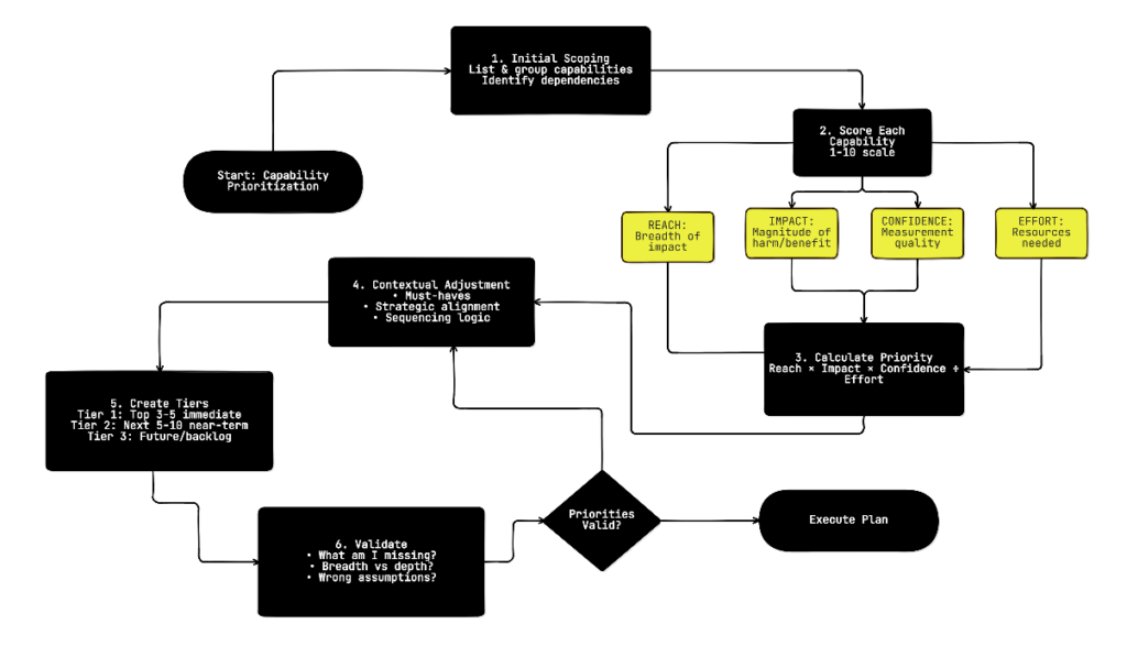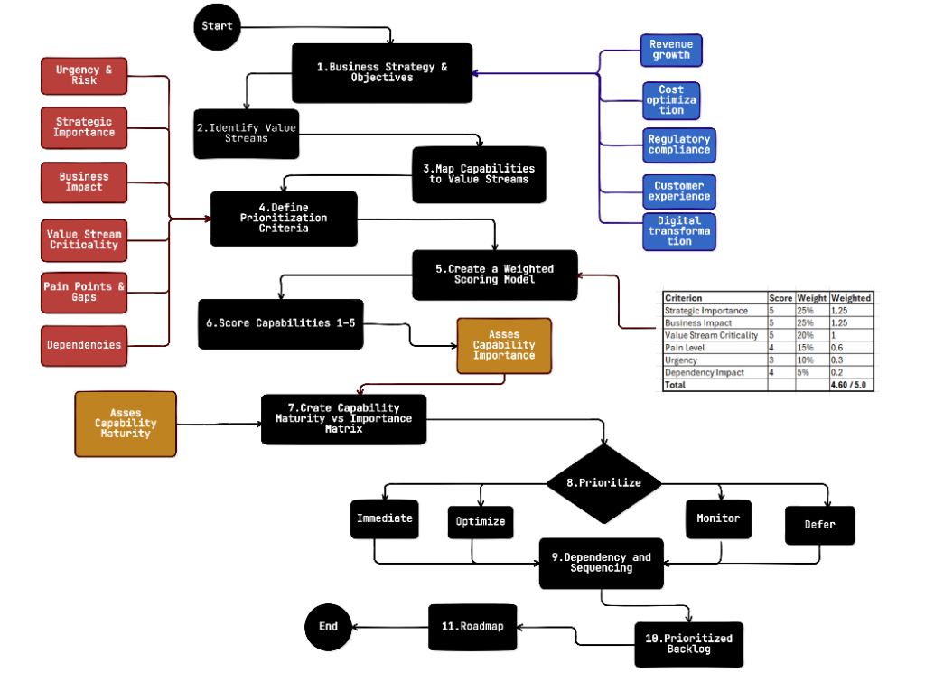 • Then it applies a weighted scoring model (e.g., strategic importance, business impact, urgency, pain points, dependencies) to rank capabilities objectively.